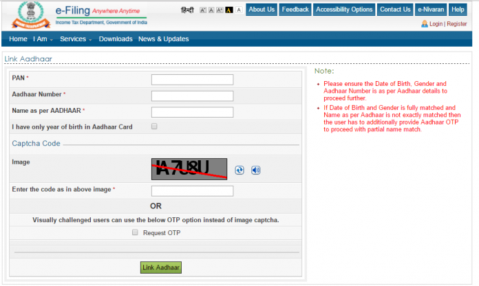 Steps 1: Visit the Income Tax department’s e-filing portal, www.incometaxindiaefiling.gov.in. On Home Page, click on the Link Aadhaar’ button on the left pane.
